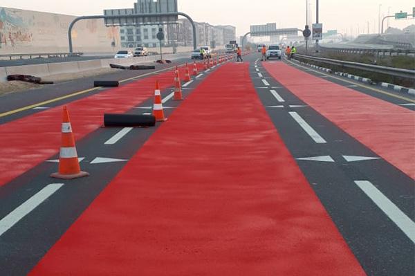 In order to put focus on speed limits and thus reduce the risk of accidents, a combination of bright red PlastiRoute™ and PREMARK™ speed limit symbols have been applied on this road stretch in the city of Dubai.