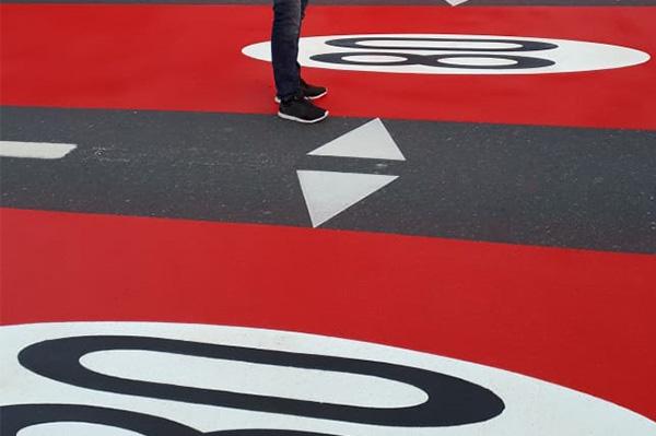 Seeing red on the road is usually not a good thing. But on this road stretch in Dubai red markings actually help increase traffic safety. The eye-catching PlastiRoute® material brightens up the road as a way to alert the drivers that it is time to slow down. At the same time, the speed limit symbols in PREMARK® stand out on top of the red surface and makes it very difficult for the driver to miss it.
