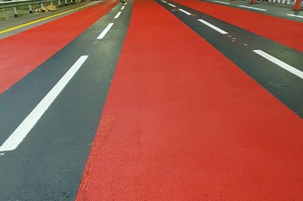 The application was made by TST Road &. Area Marking LLC Dubai, who used the AreaSpray™ machine to apply the traffic red PlastiRoute Sprayplast markings. This material is ideal for larger applications such as breaking zones, preferential area and bicycle lanes where it provides both slip-resistance and long durability. Therefore, heavy traffic zones like these can really benefit from the high anti-skid properties of this rough-textured marking.